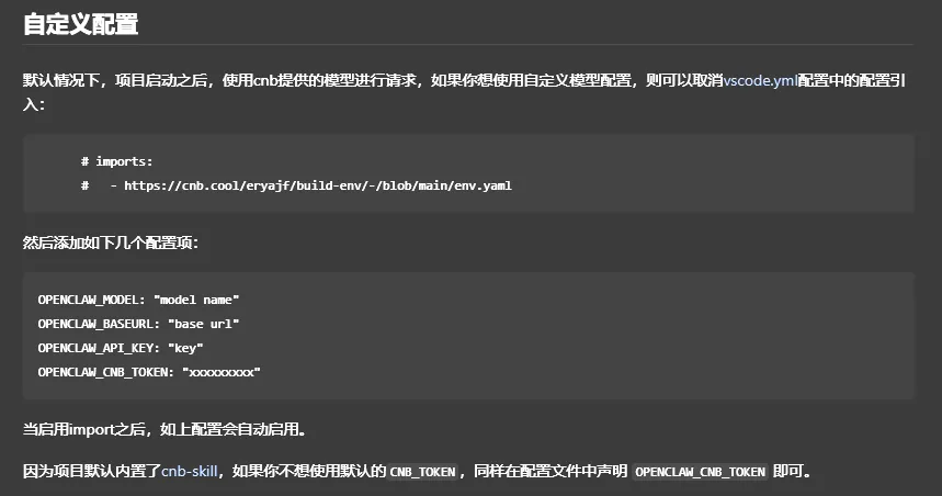 CNB平台本就是云代码开发平台,有很多热门的仓库,ComfyUI也可以在上面一键启动(可以摸索一下)。我们找到Openclaw的仓库,直接搜索即可,如:点进去,直接FORK进本地仓库,然后点击右上角的“起飞”即可。后台会启动容器,顺利的话会进入到VSCODE代码编辑页面(部分仓库会隐藏),然后就会跳转到最开始的Openclaw聊天界面。不用担心TOKEN的问题,平台集成了腾讯混元模型,支持免费调用。这点很方便,可以实现我们自己的一些想法,而又不用担心巨大的TOKEN花费。此外,对于免费的TOKEN,国家超算平台、阿里百炼、以及硅基流动等平台都有免费的使用额度。如何在CNB平台中集成第三方模型,仓库一般都会有说明,如:3、idea实现