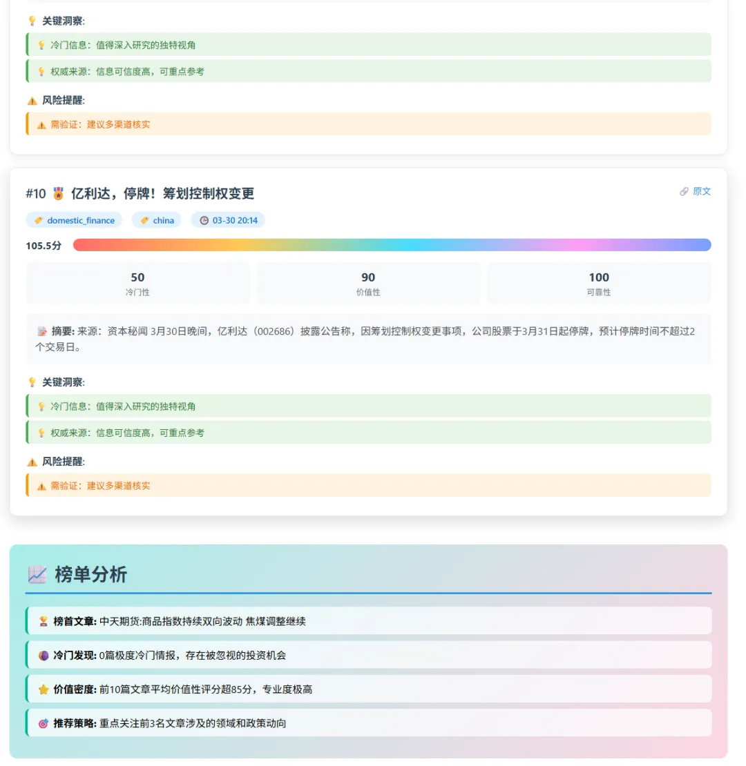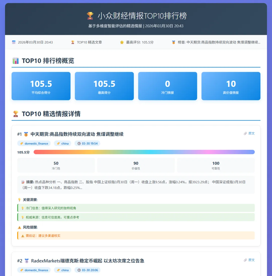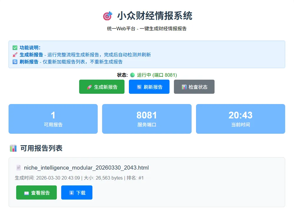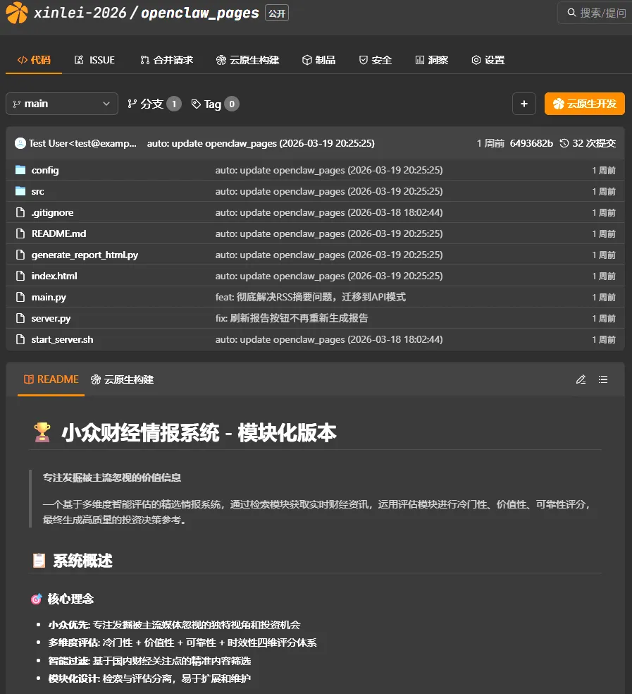 Openclaw有意思的地方就在于能够帮助你把后台、前台、各个程序集成到一块,相当于你的个人助手。比如你订一张机票,不再需要你去打开软件、比价等等,它会直接帮你规划好行程,告诉你几点到几点去机场。当你有一个好的idea的时候,你只需要告诉它,它就会帮你实现,而你并不需要这方面的技能,不需要coding、debug,人人都是产品经理的时代正在慢慢到来。如:我有个想法,想做一个每日的财经日报,不同于主流的财经软件,头条是非常热门的新闻,我希望有一种算法能够获取一天的所有有价值的新闻(不一定是热门新闻),然后有一个评估系统,能够帮助我从那么多的新闻中筛选出有价值但是没那么热门(甚至冷门)的新闻。这很重要,对于投资者来说,新闻的价值就是获取的利润空间。ok,我直接告诉它我要做的事情,很快一个博客系统的框架就搭出来了:然后我们调用一下server.py脚本,启动整个程序:点击生成新报告后会生成今日的新闻报告,这些新闻的获取时段、获取源都是可设置的,评估方式,怎么打分也都是你自己的idea,告诉openclaw,让它帮你实现。点击查看报告后会有一份很精美的HTML页面呈现,这已经不需要像传统方式一样去设计UI、切图、再到开发的实现流程,效果很棒。我这里限制了10条有价值的财经新闻,及时生成及时就可以查看,同样也支持下载。你也可以告诉openclaw你要下载,无论是HTML也还是其他格式,它都能帮你做。这个静态网站,如果想要部署的话,腾讯Edge one提供非常便捷的部署方案。最后,这是免费的,只要你的每月CNB额度没有用完,就不会花一分钱。注意:你告诉openclaw帮你创建项目,帮你写代码,最后要自己把代码提交到仓库,否则下次重启容器就会丢失。有个非常智能的方案,你可以让openclaw自己写一个skill,把你的仓库和TOKEN告诉它,让他帮你提交代码,或者你可以自己在本地提交,或者下载下到本地备份也可以。总之,有想法就去做吧,coding的门槛已经不像以前那么高了!