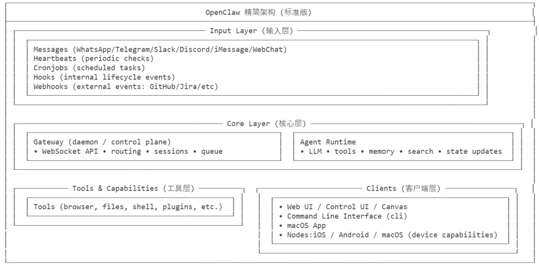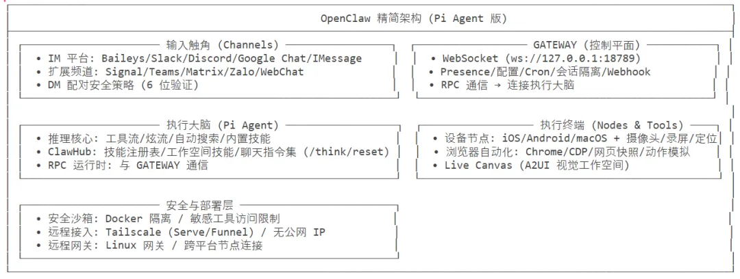OpenClaw 本质上是一个围绕集中式控制平面构建的、事件驱动的、会话隔离的单写入状态机,其整体架构是以网关为中心的星型拓扑: