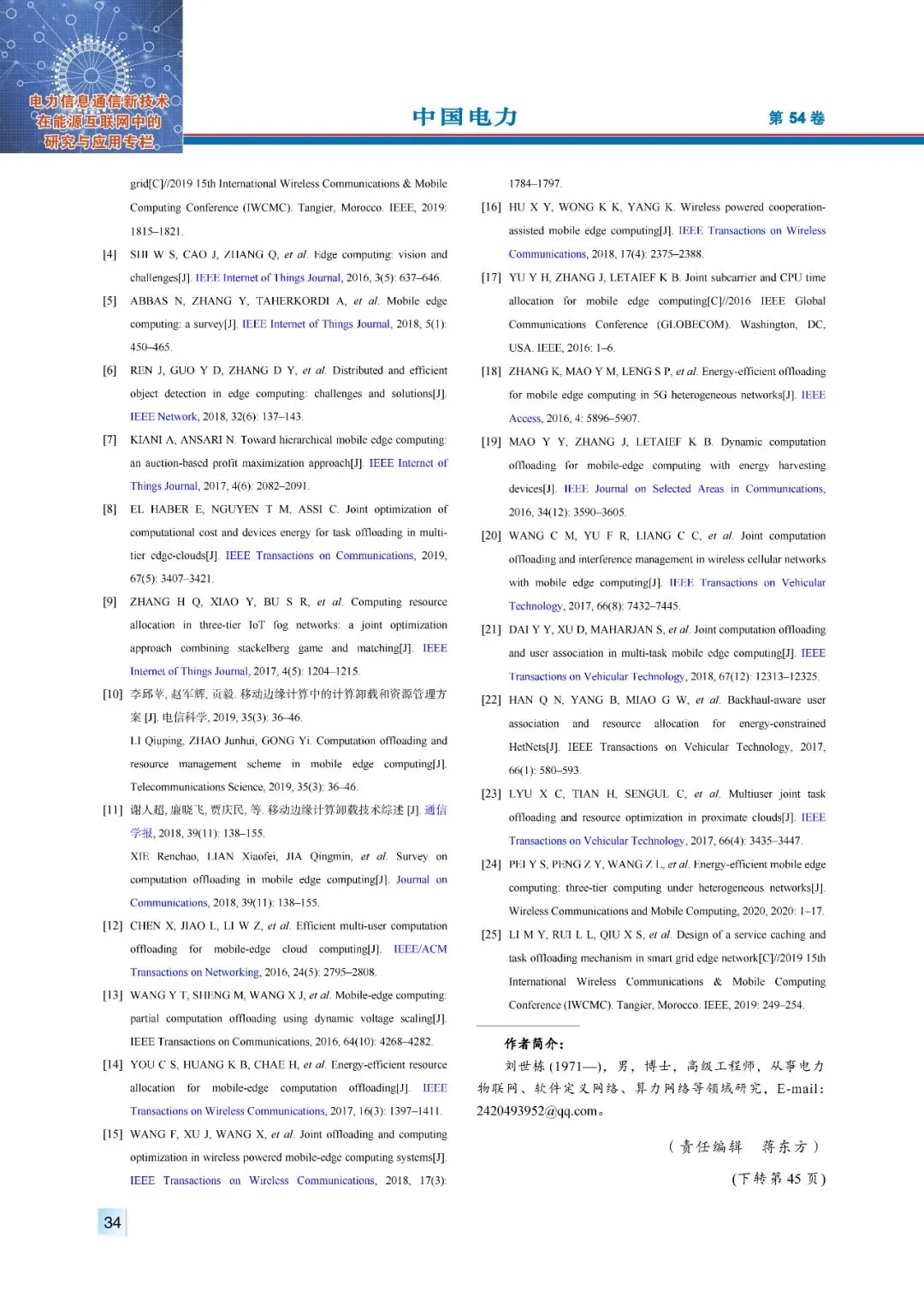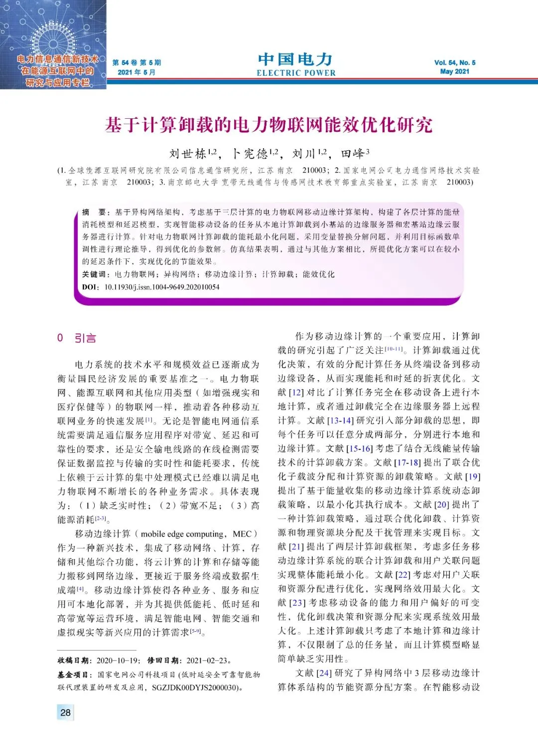 刘世栋, 卜宪德, 刘川, 等. 基于计算卸载的电力物联网能效优化研究[J]. 中国电力, 2021, 54(5): 28-34, 45.LIU Shidong, BU Xiande, YU Qiang, et al. Energy efficiency optimization based on computing offloading for internet of things in power systems[J]. Electric Power, 2021, 54(5): 28-34, 45.
