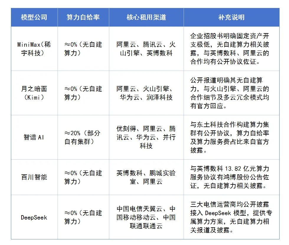 为了更清晰地看清各家模型公司的底牌,我们可以通过下表对比其算力自给情况: