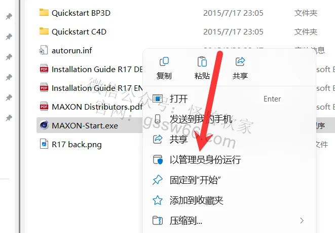 04,找到安装程序“MAXON-Start.exe”并选中,点击鼠标右键,选择“以管理员身份运行”