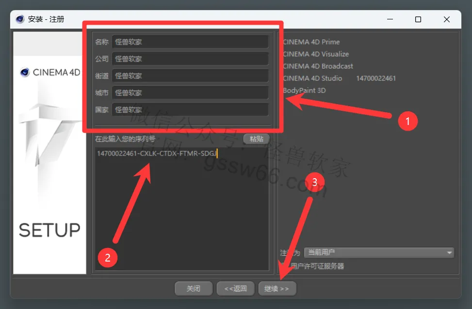 08,输入“名称、公司、街道、城市、国家”信息(可随便填写),输入序列号:14700022461-CXLK-CTDX-FTMR-SDGJ,点击“继续”