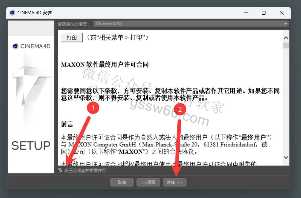11,勾选“我已经阅读并同意许可”,点击“继续”