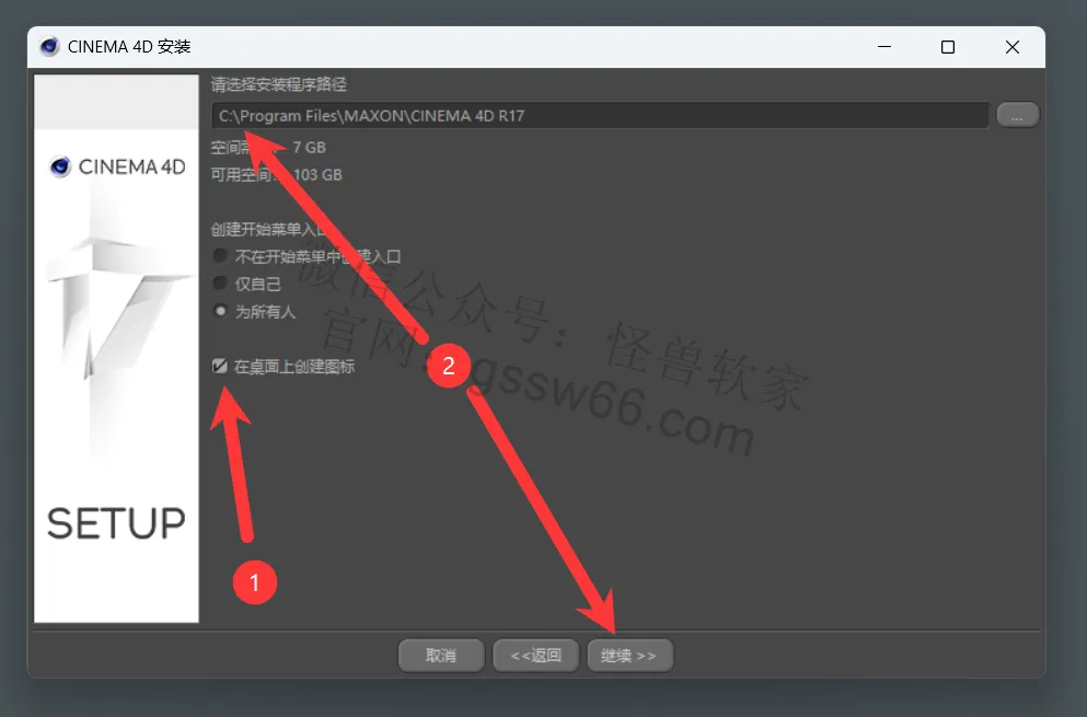 12,勾选“在桌面上创建图标”,无须更改安装位置,点击“继续”,快速更改安装位置到D盘,把安装路径首字母C改为D即可,点击“继续”。(安装路径不要出现中文),本例安装在D盘。
