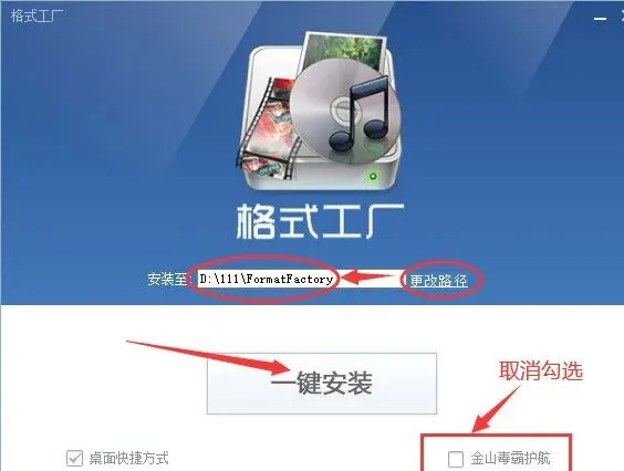 2、注意:取消勾选 金山毒霸护航,点击更改路径,选择安装位置,然后点击 一键安装