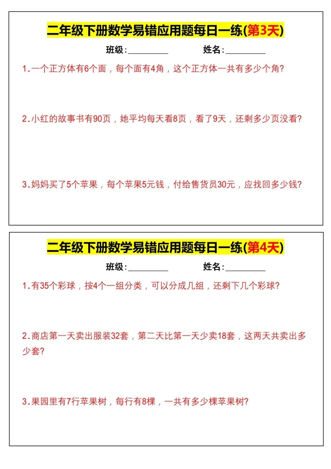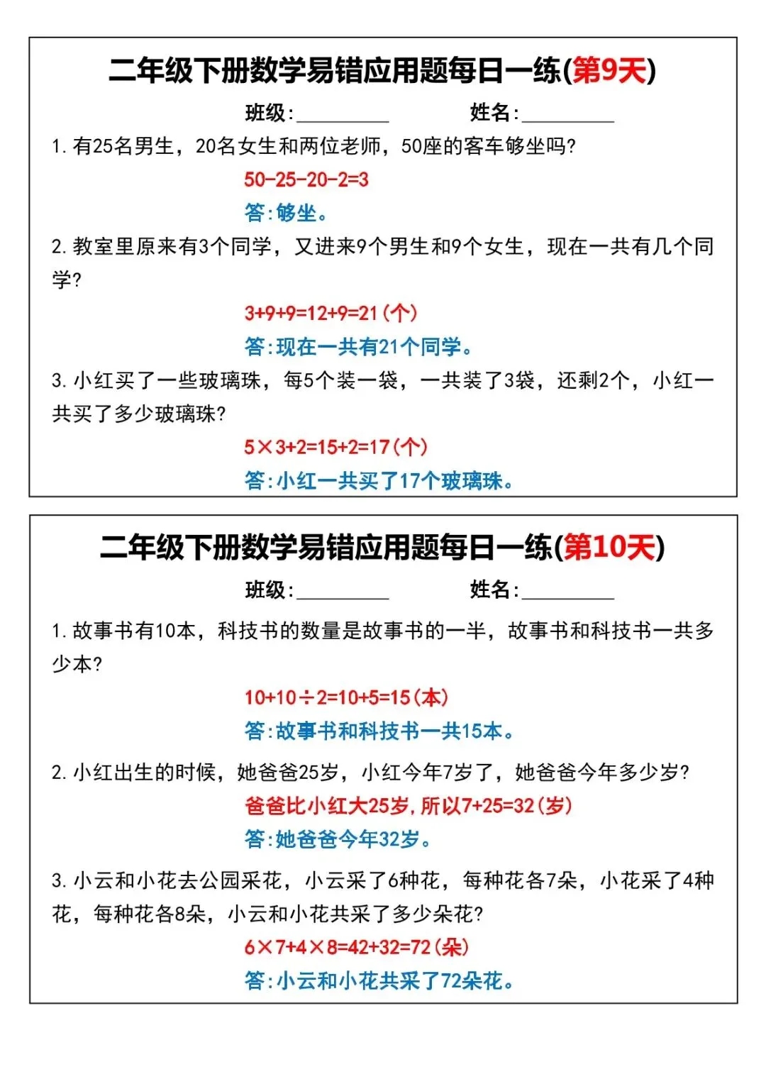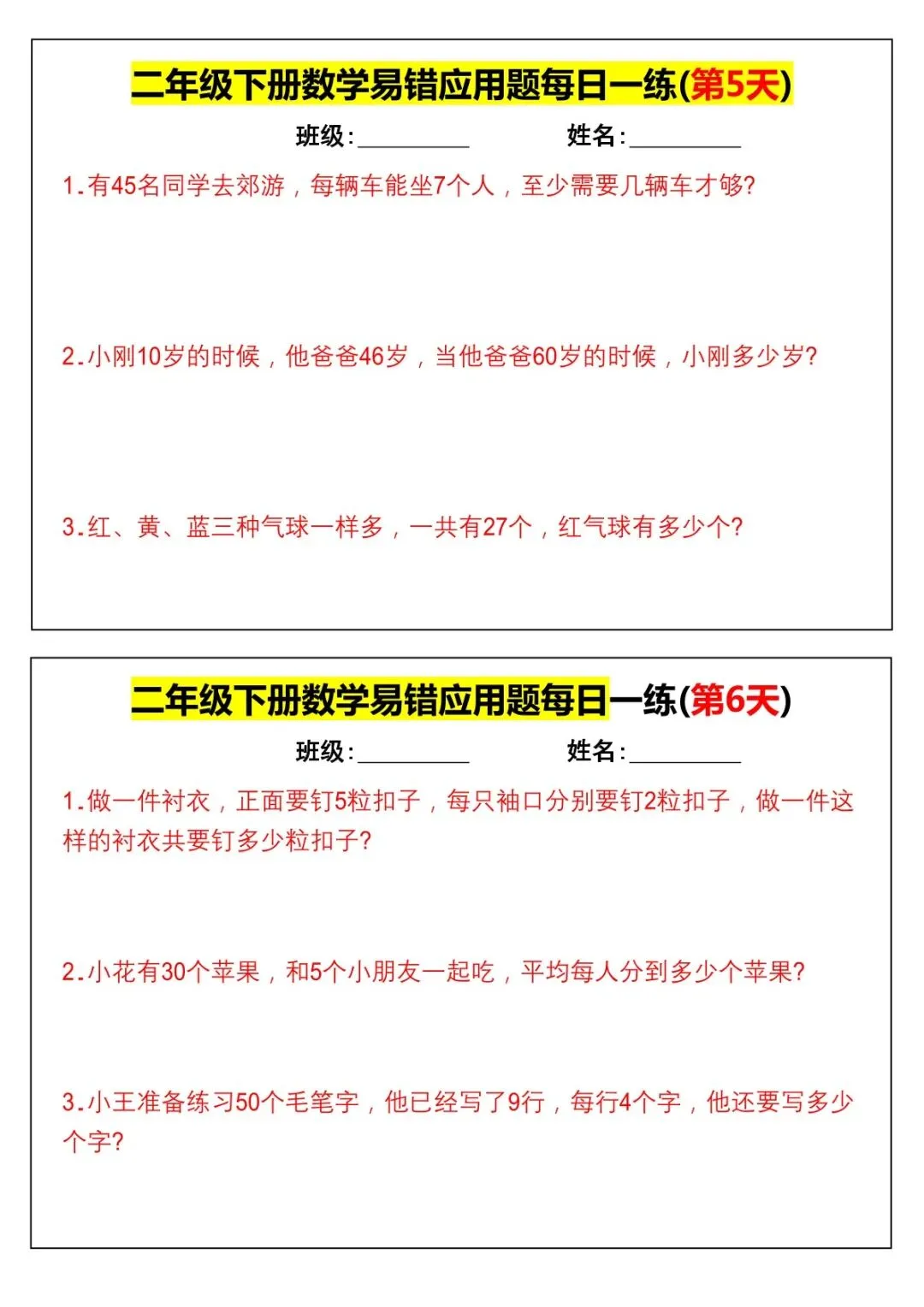 本资料同步2026 春人教版二年级下册数学,精选全册高频易错应用题,按每日 1 练编排,聚焦两步计算、有余数除法、乘加乘减、比多比少、多余条件、进一去尾等必考易错点,题量适中、天天可练,含详细答案与错因提示,可直接打印使用。