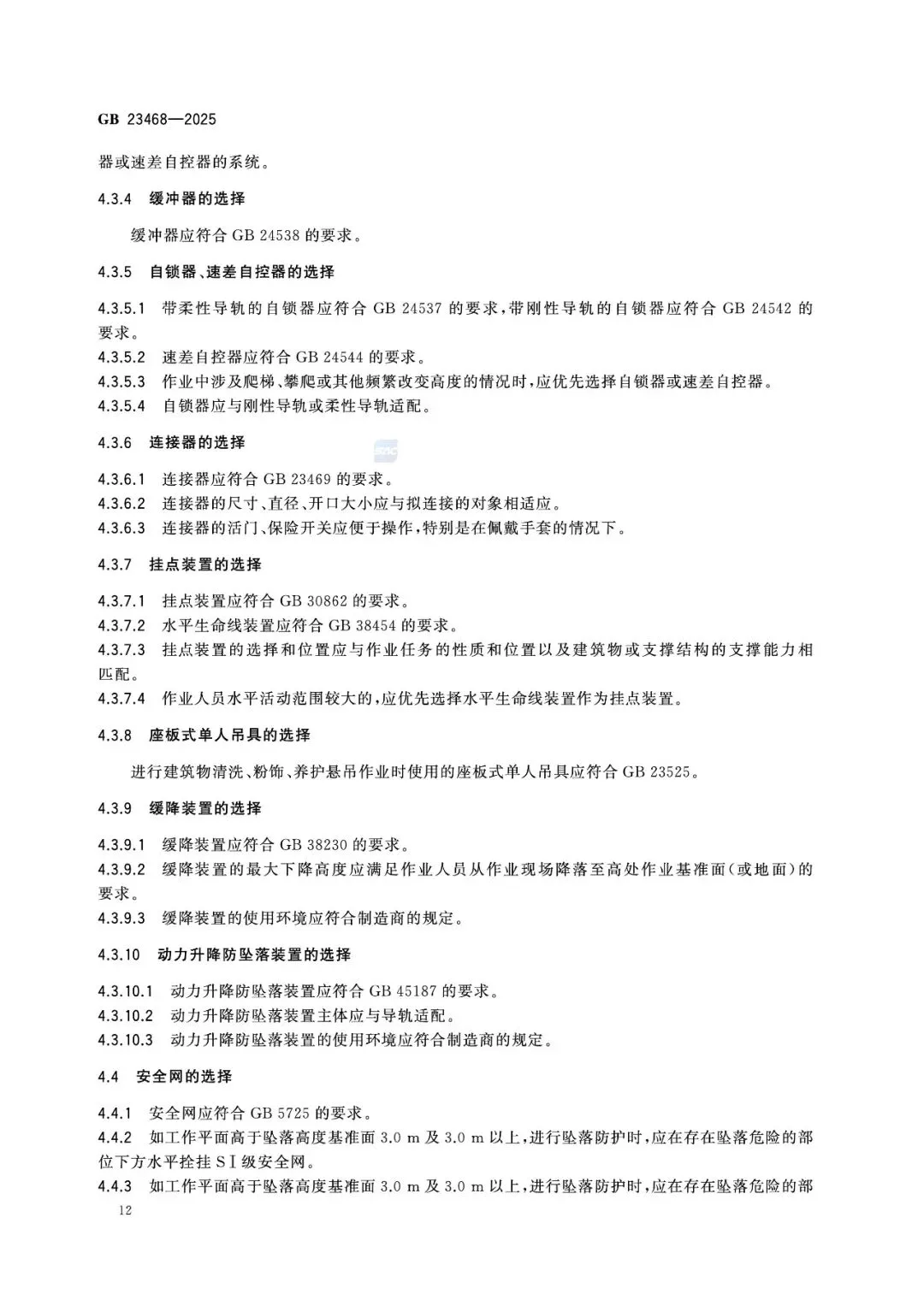 4.3 装备分类选择(强制)4.3.1 系带选择;4.3.2 安全绳选择;4.3.3 缓冲器选择;4.3.5 自锁器、速差自控器选择;4.3.6 连接器选择;4.3.8 座板式单人吊具选择……每一类装备均明确适用场景、禁止条件、匹配要求。