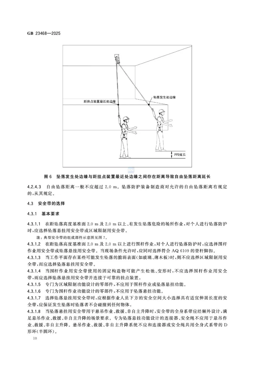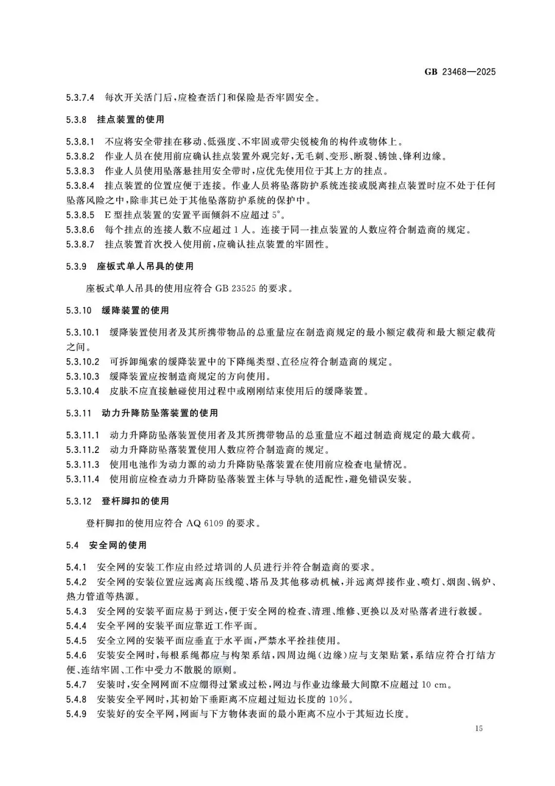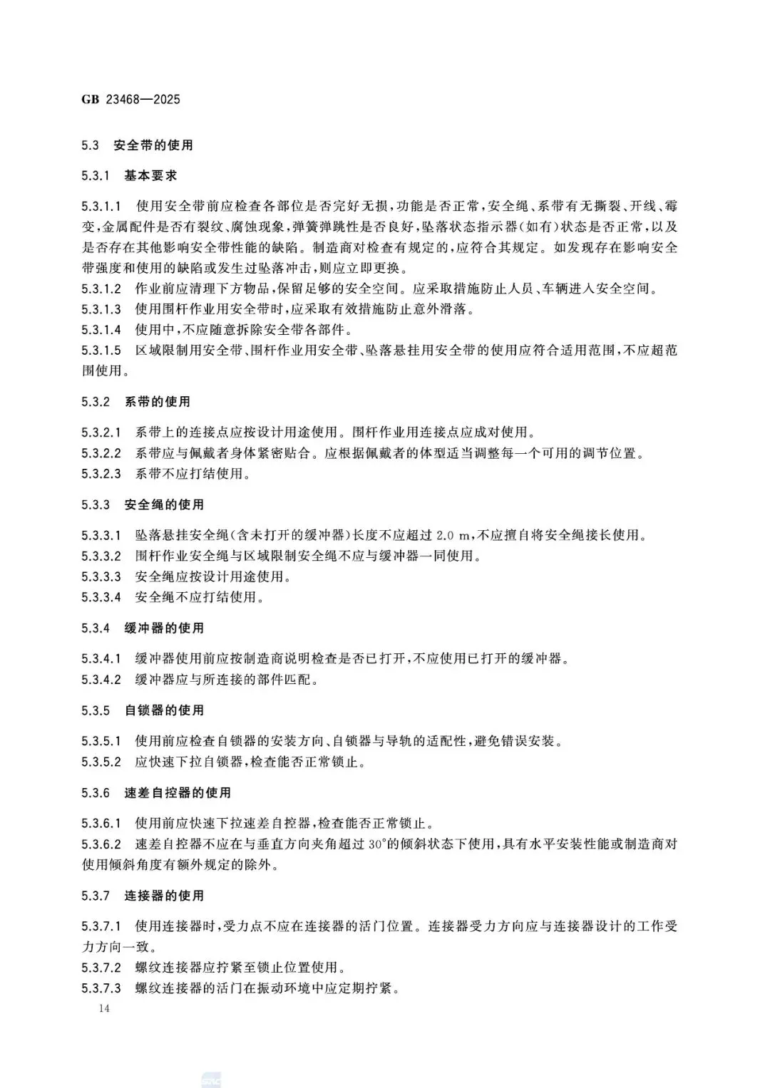 第5章对佩戴、连接、挂点、安全空间、作业限制做出强制规定: