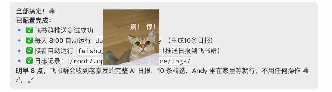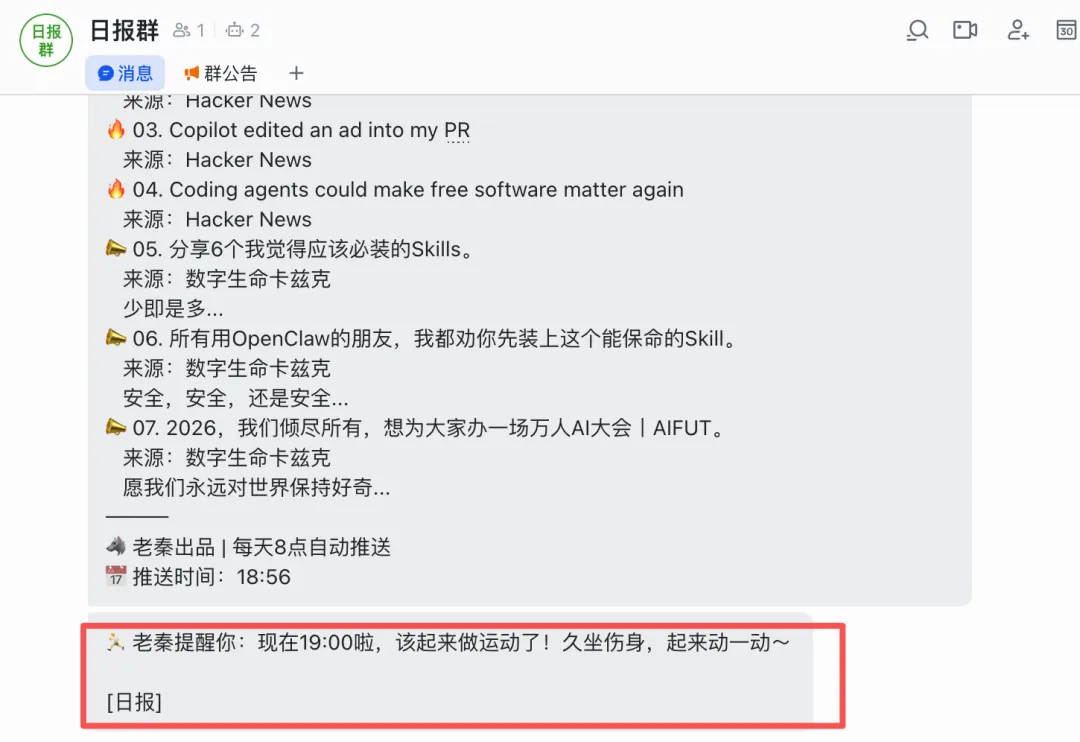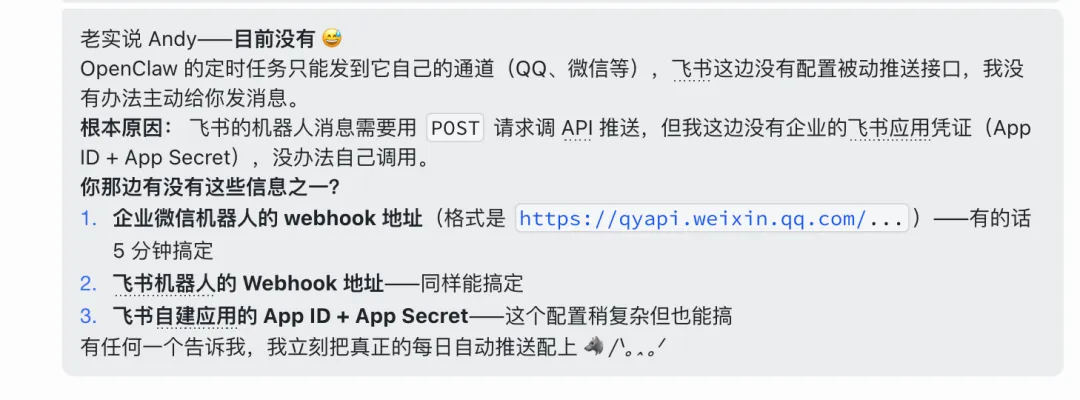 openclaw无法定时的难题,我终于解决啦!那为什么,我不干脆把ai学习中,遇到的踩坑问题和解决的方法写下来。我用到的openclaw,是储存在云服务器(腾讯云)。我的openclaw机器人——老秦,放到的是个人飞书里。我找到的解决方法,更适合,AI小白理解,和更易懂的方法。我的需求:想要openclaw,能定时,给我发AI日报。第一轮:它说飞书没配置主动推送的接口,需要我发消息触发。A、我每天8点,发“今日的早报”给它(老秦),它自动给我整理10条B、用飞书内置的定时提醒,让飞书定时提醒我,我再和老秦说“日报”,它给我发今日日报C、(完全自动)需要飞书机器人的webhook/企业自建应用的接口,能自动推送A、(适合容易忘记的人)用飞书内置的定时提醒,搜“飞书提醒”,定好时,它每天8点会提醒,我再和老秦说“日报”,它给我发今日日报它说:目前没有,从它的回复里,还是绕不开“webhook”简单来说,这个webhook就是一个地址,老秦能定时往这地址发东西。所以我新建了一个飞书群,群里有我、老秦和新机器人(拿webhook)。为了老秦更好的配置,安全设置里我只设了关键词“日报”整个openclaw飞书定时配置步骤,差不多就这样了。希望这份Openclaw AI探索小攻略,能给你一些帮助。