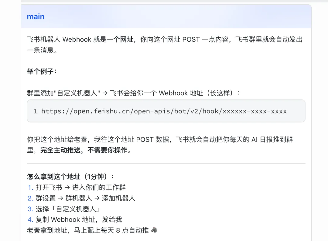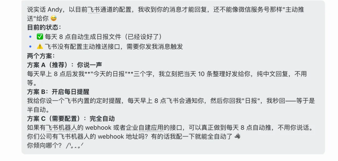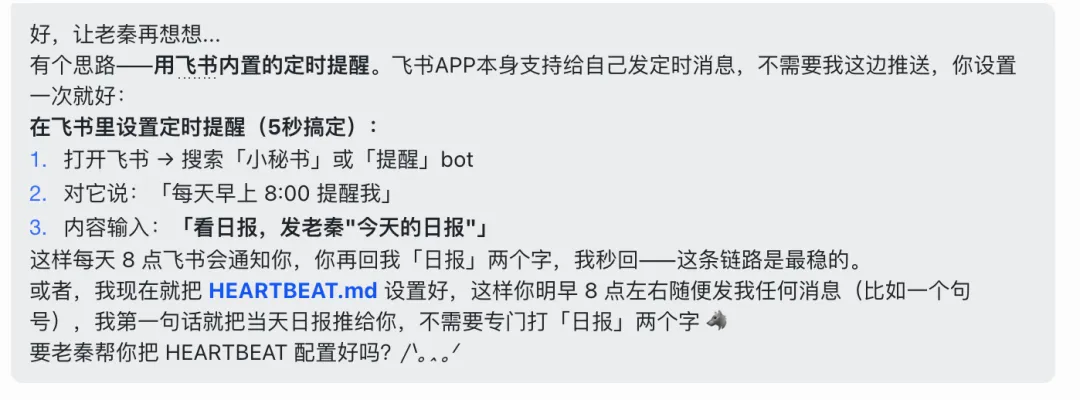 openclaw无法定时的难题,我终于解决啦!那为什么,我不干脆把ai学习中,遇到的踩坑问题和解决的方法写下来。我用到的openclaw,是储存在云服务器(腾讯云)。我的openclaw机器人——老秦,放到的是个人飞书里。我找到的解决方法,更适合,AI小白理解,和更易懂的方法。我的需求:想要openclaw,能定时,给我发AI日报。第一轮:它说飞书没配置主动推送的接口,需要我发消息触发。A、我每天8点,发“今日的早报”给它(老秦),它自动给我整理10条B、用飞书内置的定时提醒,让飞书定时提醒我,我再和老秦说“日报”,它给我发今日日报C、(完全自动)需要飞书机器人的webhook/企业自建应用的接口,能自动推送A、(适合容易忘记的人)用飞书内置的定时提醒,搜“飞书提醒”,定好时,它每天8点会提醒,我再和老秦说“日报”,它给我发今日日报它说:目前没有,从它的回复里,还是绕不开“webhook”简单来说,这个webhook就是一个地址,老秦能定时往这地址发东西。所以我新建了一个飞书群,群里有我、老秦和新机器人(拿webhook)。为了老秦更好的配置,安全设置里我只设了关键词“日报”整个openclaw飞书定时配置步骤,差不多就这样了。希望这份Openclaw AI探索小攻略,能给你一些帮助。