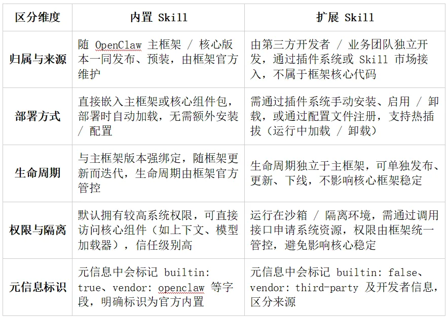 因为内置Skill属于OpenClaw主框架,开源并经过了大量开发人员的验证,就像操作系统附带的工具,如windows的写字板、录音、视频、日历等,一般来说,风险相对较小。