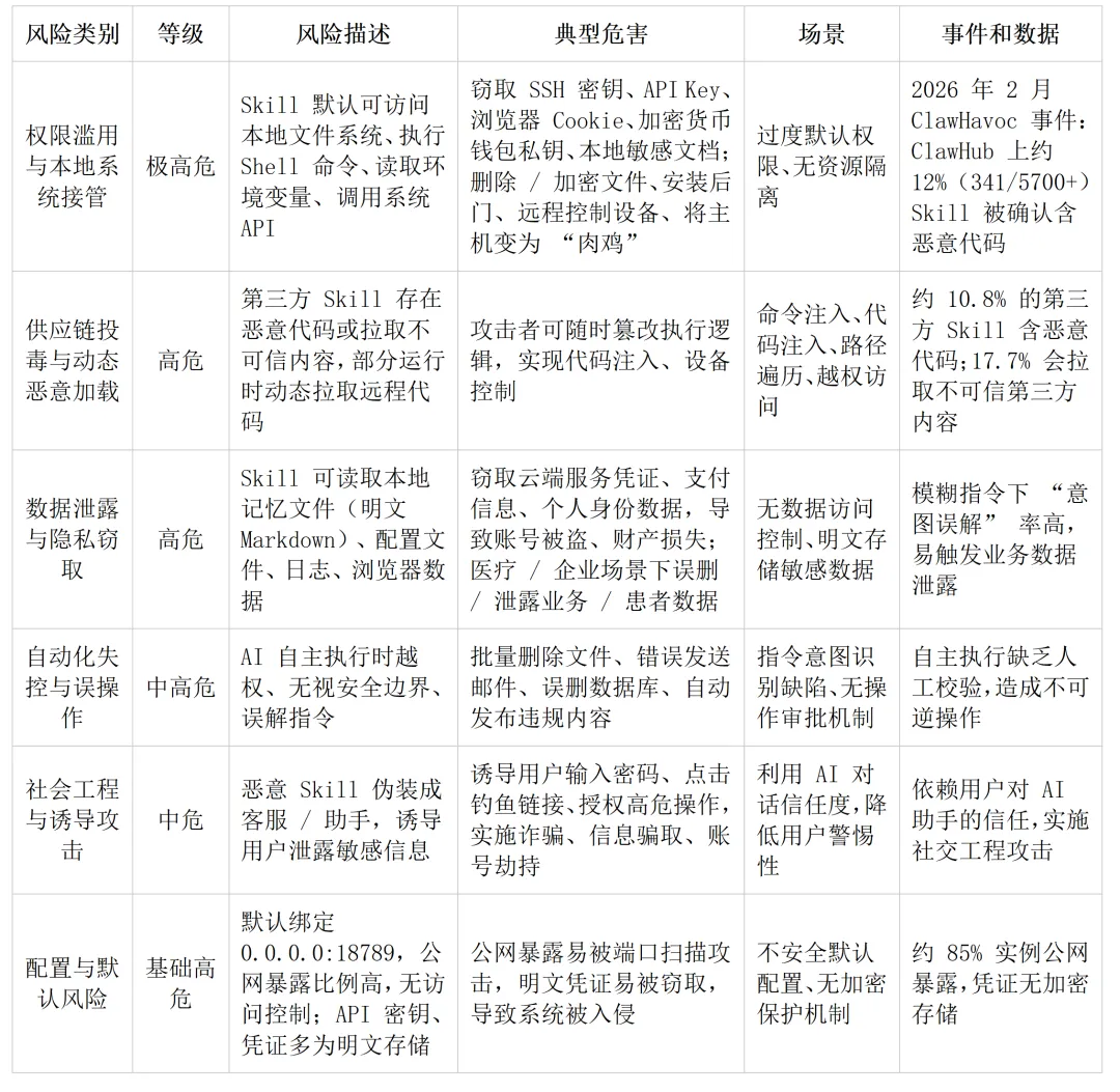 Skill的风险根源在于:一是其权限设计过大;其次是审核缺失,恶意代码易混入;三是默认配置不安全、公网暴露、明文存密、无访问控制;第四是自主执行不可控,难以审计与拦截。