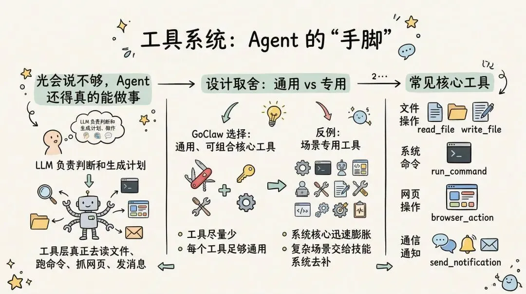 工具是 Agent 的”手脚”。LLM 负责判断和生成计划,真正去读文件、跑命令、抓网页、发消息,靠的是工具层。GoClaw 选择的是一套偏通用、可组合的核心工具,而不是针对每个场景都去发明一个专用工具。