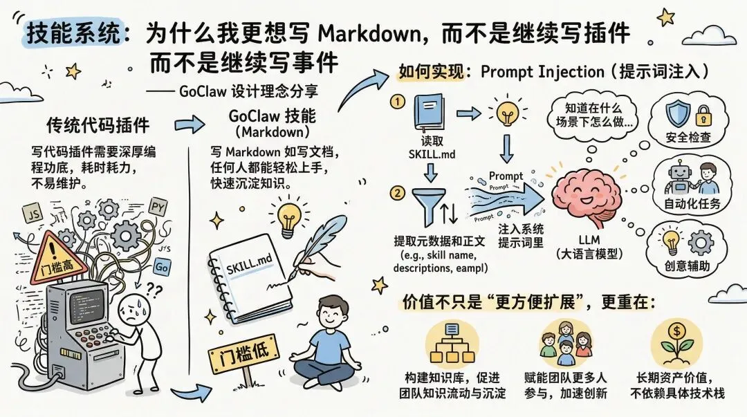 为什么这么设计?因为写代码插件的门槛高,写 Markdown 文档的门槛低得多。技能通过 Prompt Injection 实现:系统读取 SKILL.md,提取元数据和正文,再把它注入系统提示词里,LLM 就知道在什么场景下应该怎么做。