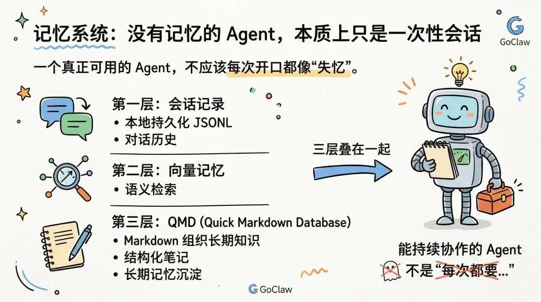 一个真正可用的 Agent,不应该每次开口都像”失忆”。GoClaw 的记忆系统大致可以分成三层:第一层是会话记录,也就是本地持久化的 JSONL 对话历史;第二层是向量记忆,用于做语义检索;第三层是 QMD(Quick Markdown Database),用 Markdown 组织长期知识,适合沉淀结构化笔记和长期记忆。