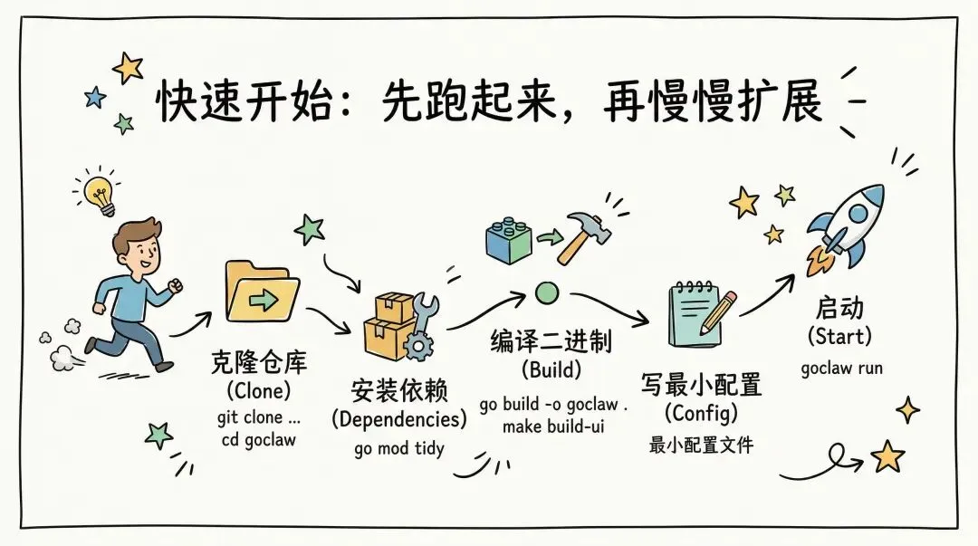 如果你只是想尽快把 GoClaw 跑起来,路径其实很直接:克隆仓库,安装依赖,编译二进制,写最小配置,然后启动。