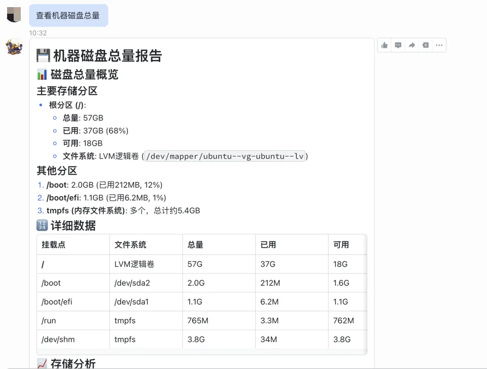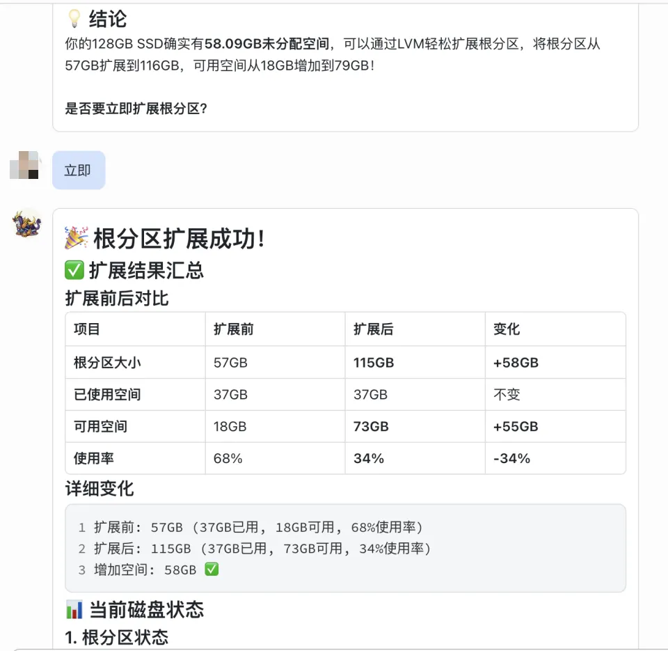 当然,这类能力也天然伴随着边界。像磁盘扩容、文件删除、系统配置修改这种操作,更适合先在实验机、测试环境或者你完全可控的机器上使用。Agent 能帮你提高效率,但前提仍然是:权限要可控,风险要可知,回滚路径要提前想清楚。