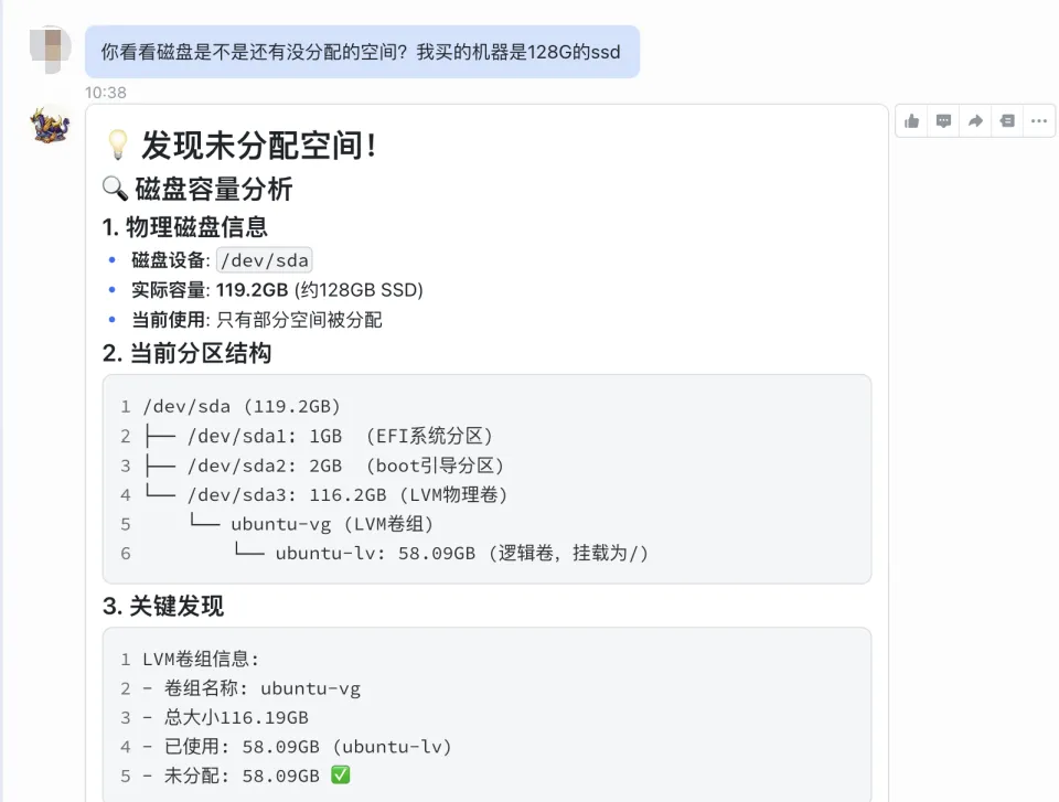 事情的起因很简单。我一直对磁盘空间比较敏感,平时会让自己的 Agent 去检查机器磁盘使用情况。有一次检查时,它给出的结果和我的印象对不上:这台机器买的时候明明是 128GB,但系统里实际可用的分区却只有六十多 GB。