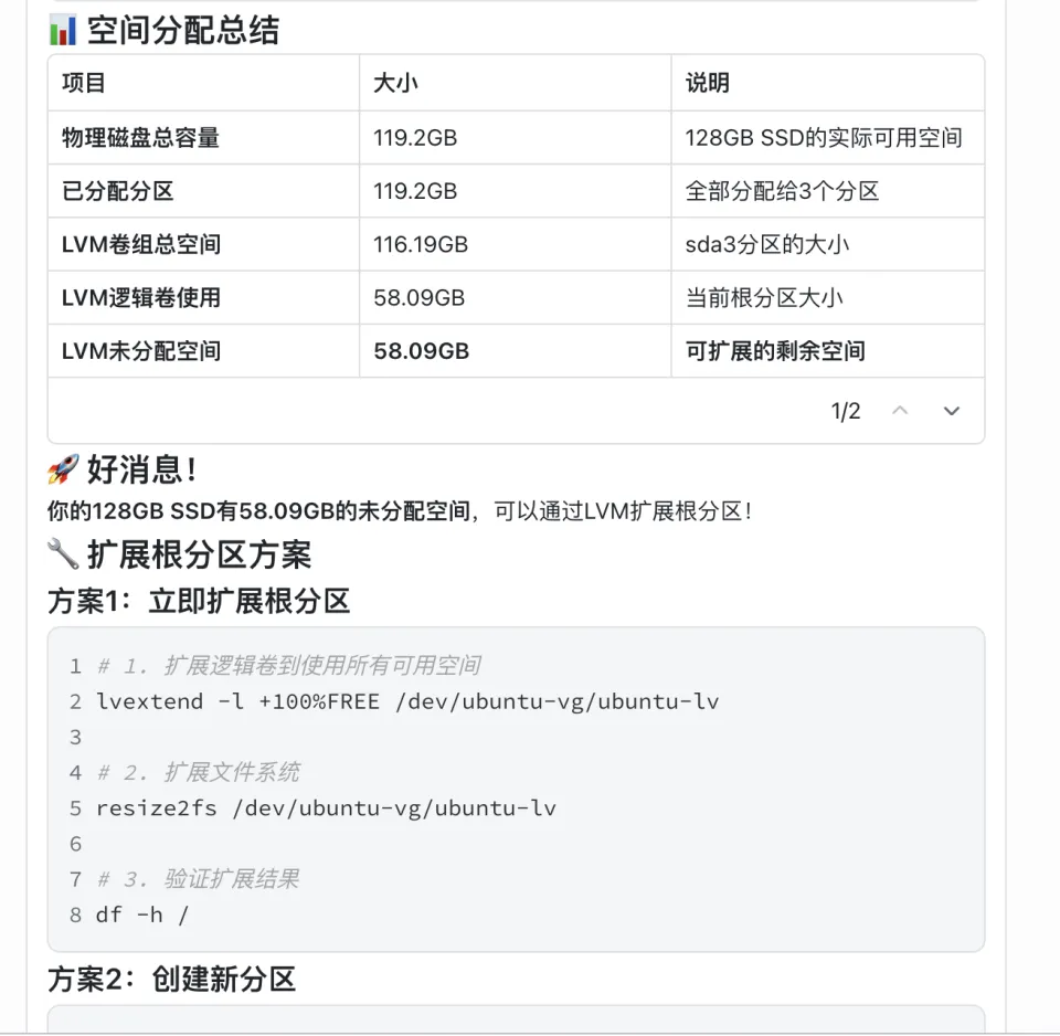 继续排查之后,问题就清楚了:原来机器上还有大约 58GB 的空间根本没有分配到当前分区,这是我在安装Ubuntu的时候遗漏了。这不是常规的“磁盘快满了,该清理了”,而是一个更偏系统运维的问题:先确认现状,再识别未分配空间,最后决定怎么把它扩容到根分区。