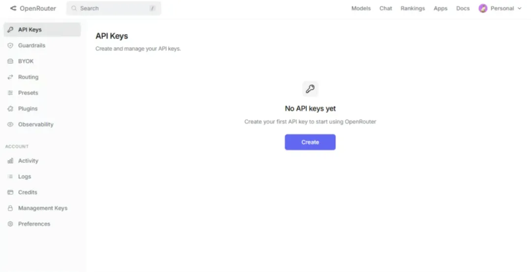想拿 API Key 的话,登录之后进 API Keys 页面,点 Create,填个名字,其他不用管,点确认就拿到 Key 了。