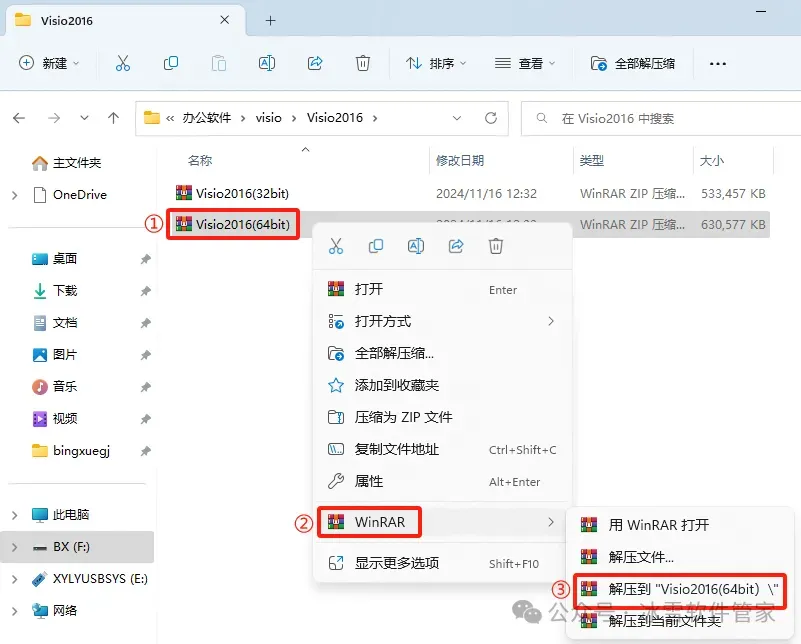 1.解压安装包:①鼠标右击【Visio2016 (64bit)】压缩包②选择电脑上安装的解压软件(如:WinRAR压缩)③点击【解压到 Visio2016 (64bit)】。