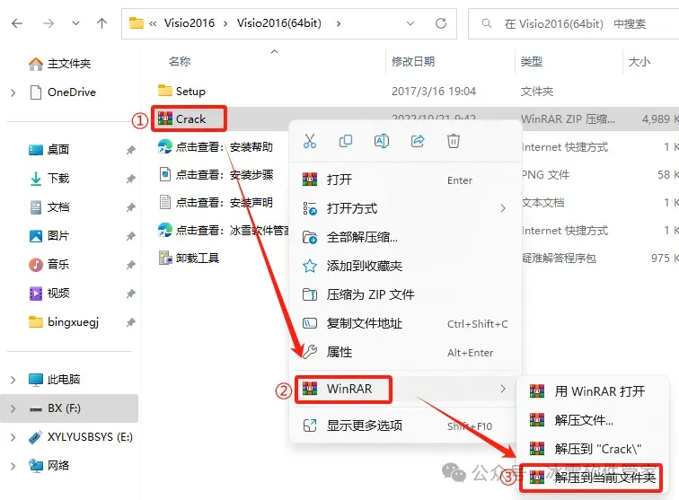 9.打开安装包解压后的【Visio2016(64bit)】文件夹,①鼠标右击【Crack】压缩包②选择电脑上安装的解压软件(如:WinRAR压缩)③点击【解压到当前文件夹】。