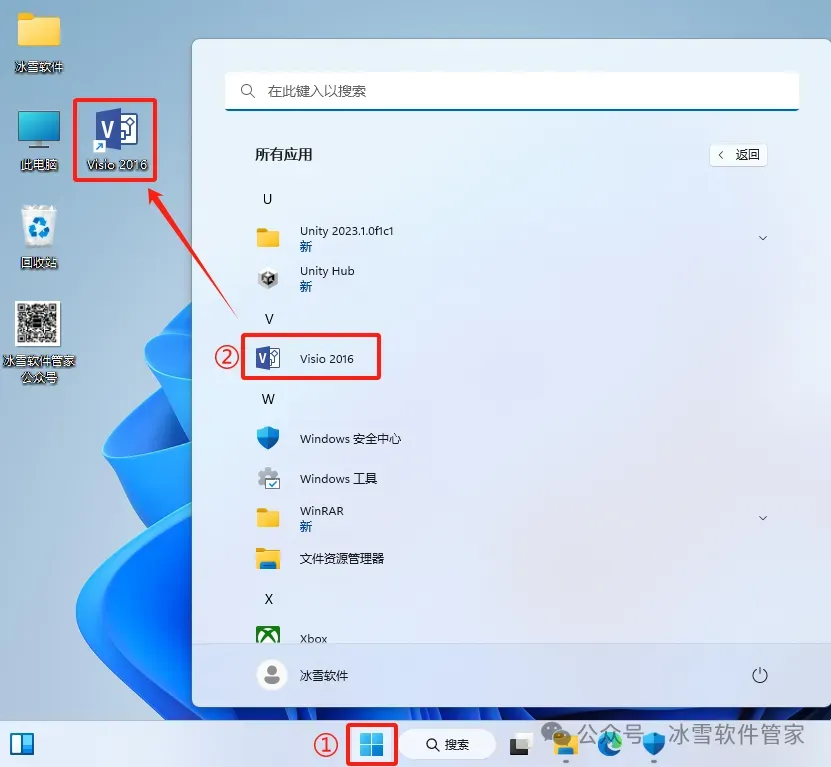 13.创建桌面启动快捷方式:①点击桌面任务栏中的【开始图标】②在所有应用中找到【Visio 2016】并拖到电脑桌面。