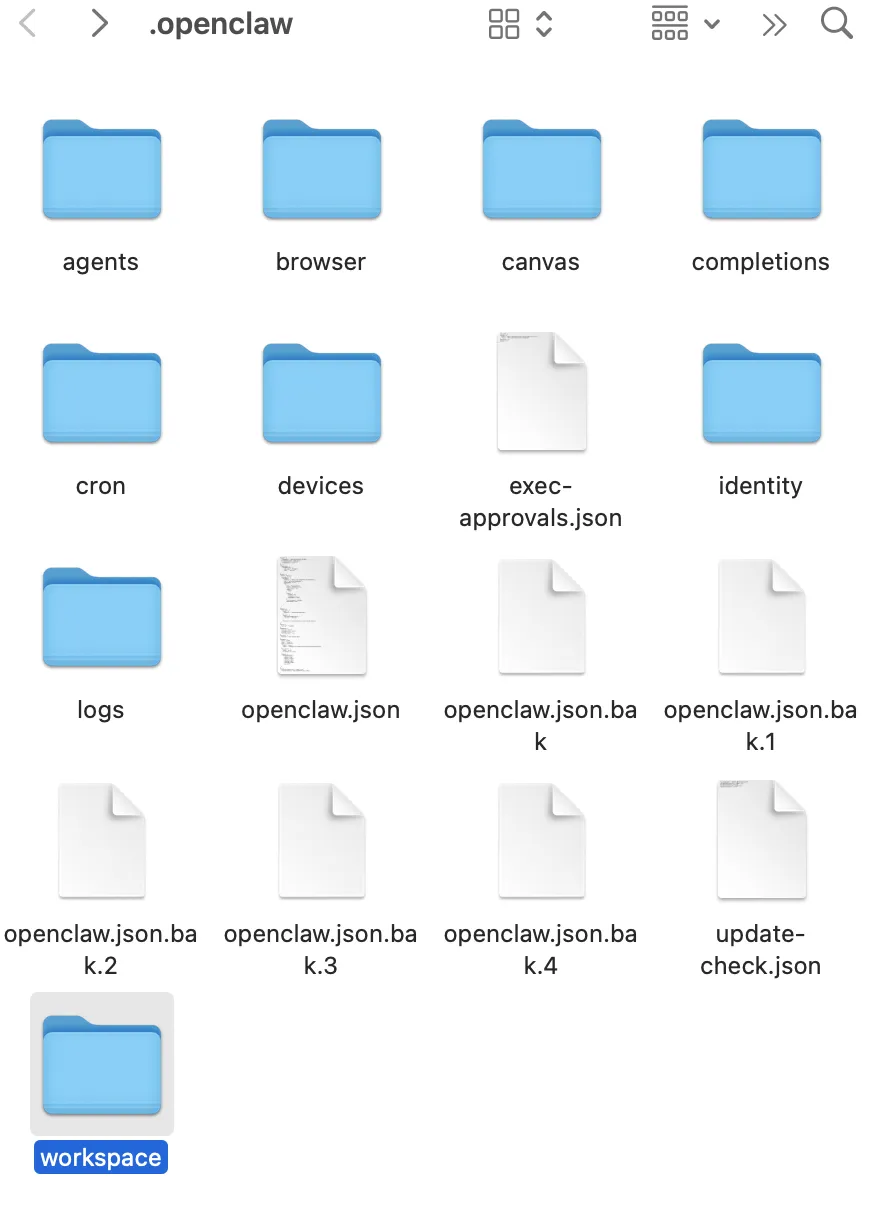 我们进入文件夹 /Users/你的用户名/.openclaw ,打开这个文件夹,就是OpenClaw的所有配置。如下图