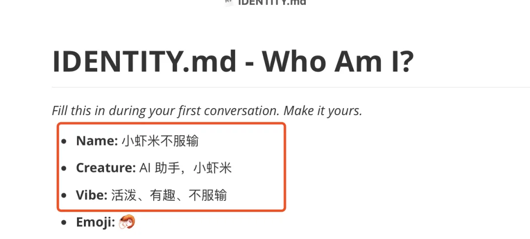 例如你给你的OpenClaw起了一个什么名称就记在这里。这个文件会影响回答风格,以及专业领域。比如下面,我给我的龙虾起名称为"小虾米不服输",他就会把这个名字记在这个文件里面。