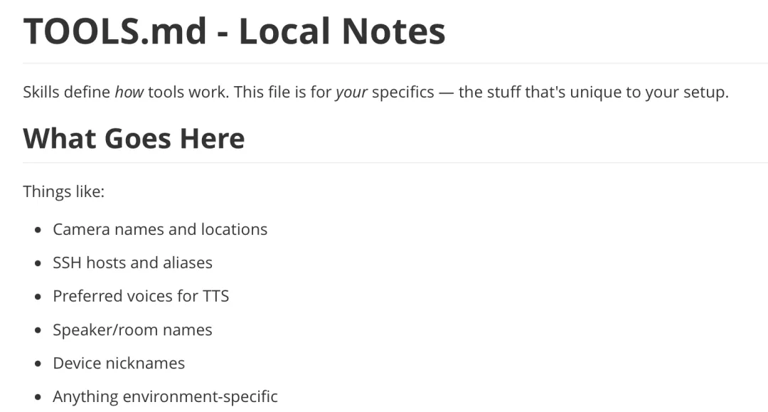 五、TOOLS.md —— Agent 能用什么工具