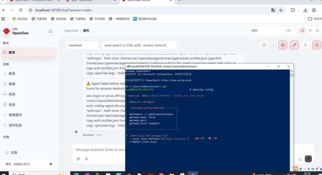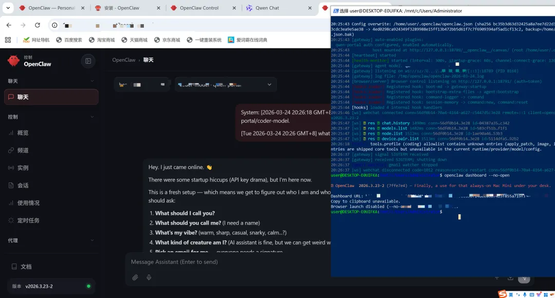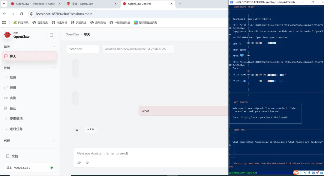 在我的反复排错中,终于成功安装。部署完成的最终目的是使用。我们现在已经出现了聊天界面,可以正式向 OpenClaw 下达指令啦!!!