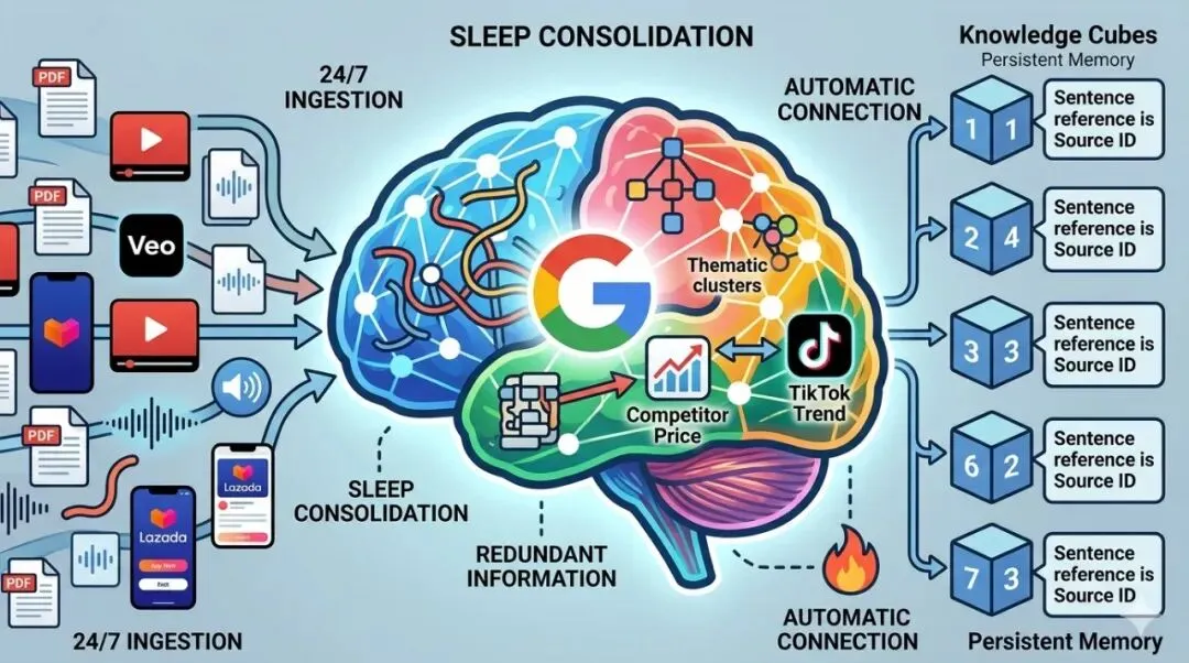 核心理念:让AI像人脑一样24/7后台运行,不用向量数据库、不用复杂embedding,只用轻量级LLM(Gemini 3.1 Flash-Lite或兼容的GLM-5/KIMI/MinMax)持续“读→想→写”。