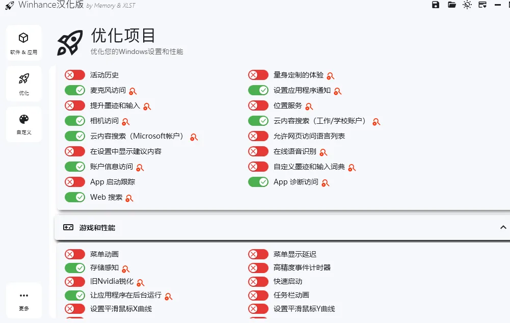 第二个大类是优化系统设置,在这里可以一键关闭不想要的服务,都是日常玩机时需要关闭和开启的选项,改动对系统本身运行不会造成故障。