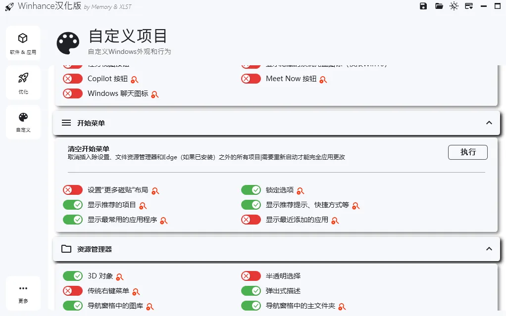 还有一个自定义的大类,这里可以对系统设置进行调整,像是任务栏去除新闻和信息流、隐藏各种按钮、将图标左对齐、禁用系统托盘自动隐藏等等。