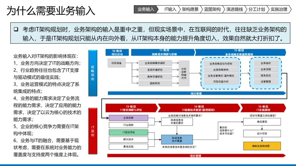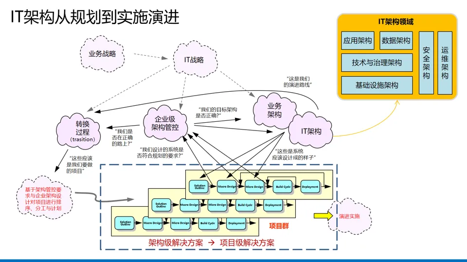 演进路线设计:通过差距分析识别现状与蓝图的差异,按可行性、业务影响、优先级排序关键任务,组合形成项目群,分阶段推进架构落地,平衡短期成效与长期价值。