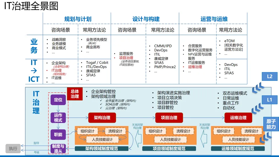核心框架:构建 “总体治理 + 架构治理 + 项目治理 + 运维治理” 四层治理体系,覆盖规划与计划、设计与构建、运营与运维全生命周期,通过组织设计、流程规范、人员赋能实现治理落地。
