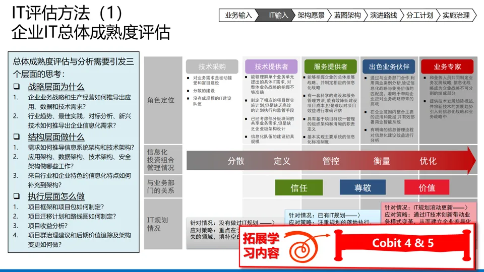 总体治理:明确 IT 定位与运作模式,推荐采用联邦制,建立 “需求层 - 决策层 - 架构层” 三层决策机制,通过 IT 决策委员会统筹重大投资与项目建设,确保治理与业务战略匹配。
