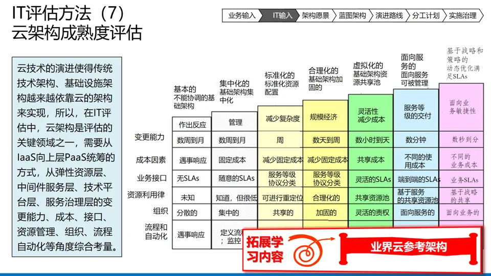 细分领域治理:架构治理聚焦架构资产管控与标准规范制定,通过架构契约保障实施一致性;项目治理区分稳态与敏态项目,采用差异化决策流程,强化项目群管控与价值跟踪;运维治理适应云运维模式变化,推进例行操作标准化与自动化,构建 “部署流水线 - 监控告警 - 故障处置 - 性能优化” 全流程管控。