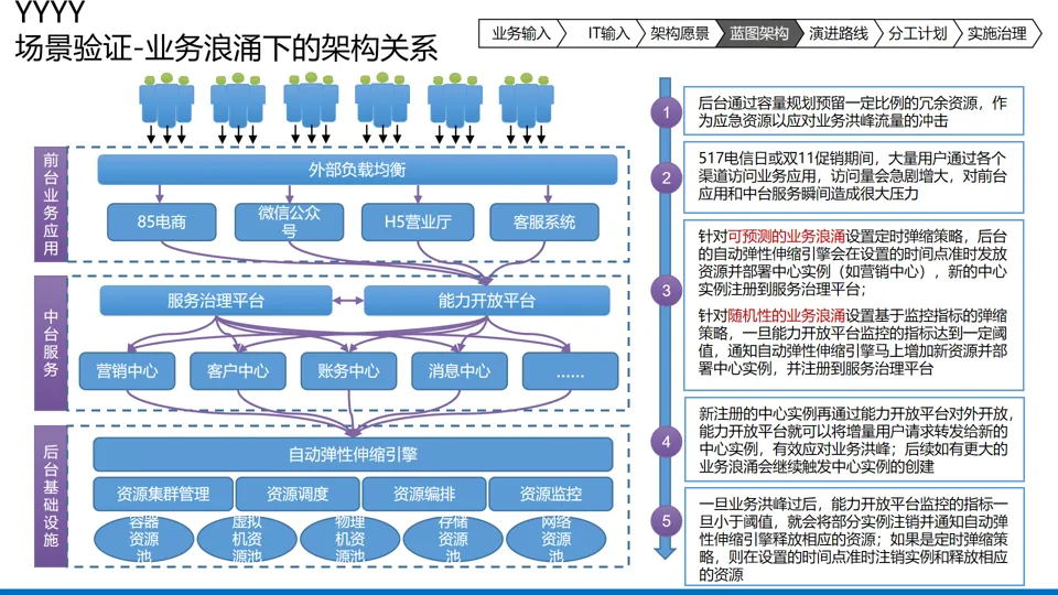 核心原则:坚持业务与 IT 融合,以业务战略为导向,兼顾稳态业务的稳定性与敏态业务的敏捷性,实现 “动静结合” 的柔性 IT 架构建设。