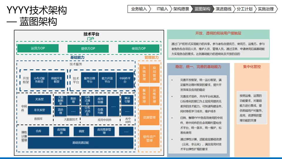 关键设计方法:应用架构按 “能力中心” 划分,遵循内聚性、高自制、协同性原则;数据架构聚焦主题域划分与数据治理,实现生产与分析数据、主数据与业务数据分离;技术架构构建 “平台层 + 基础设施层”,依托云技术实现资源弹性调度。