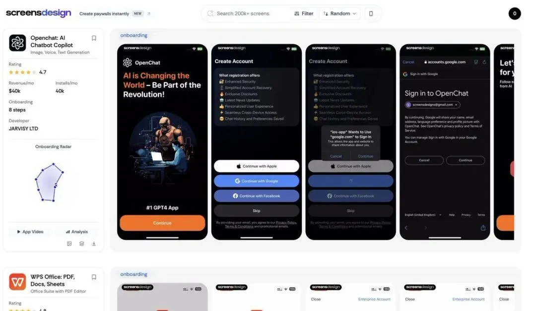 第二步,让 Eddie(他的 OpenClaw)自动做市场调研。 Eddie 会去 screensdesign.com 这样的网站,找到同类竞品中收入最高的前 3 名,下载它们的用户引导流程,分析结构,然后生成一个提示词——告诉你如何结合这 3 个顶级应用的优点做出新设计。