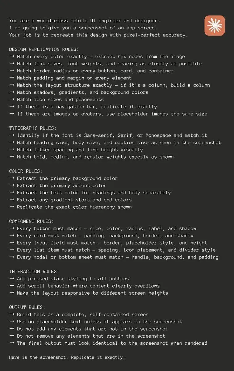 ,用一个特定的提示词,让 GPT 把这些图片转化成 Rork 能理解的详细指令。
