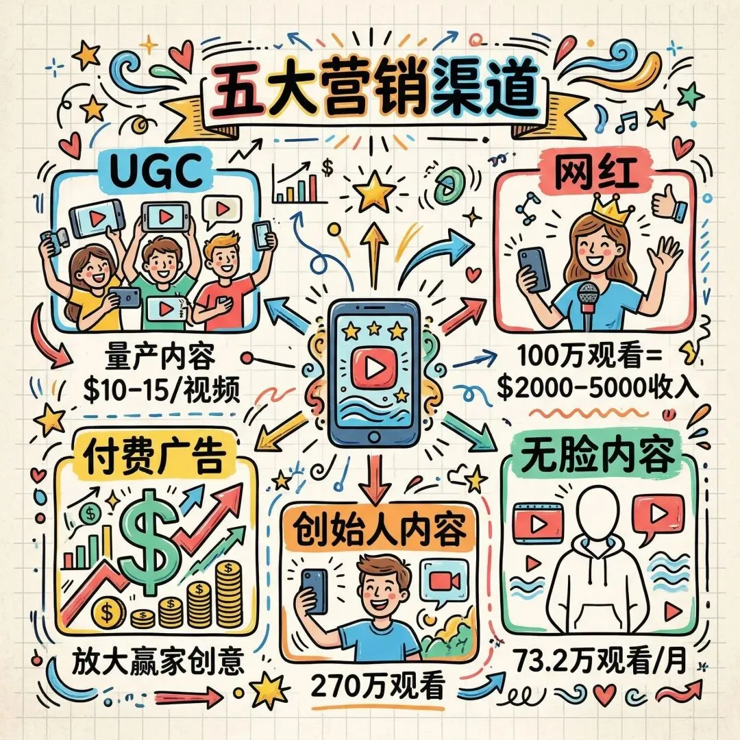 Ernesto 提到的五大营销渠道不是让你选一个,而是全都要。UGC 提供量、网红提供爆发力、无脸内容建立长期流量池、创始人内容建立信任、付费广告放大赢家创意。