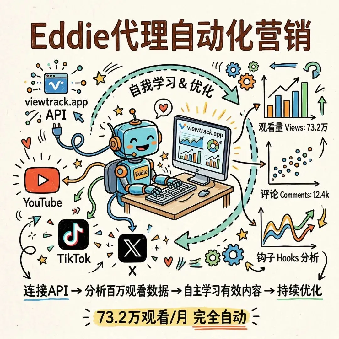 传统的规模化要么砸钱(月费 3 万美元请代理公司),要么拼命(创始人每天干 8 小时)。但 Eddie 通过 API 连接 viewtrack.app,能实时分析数百万观看数据,自主学习什么内容有效并加倍投入。