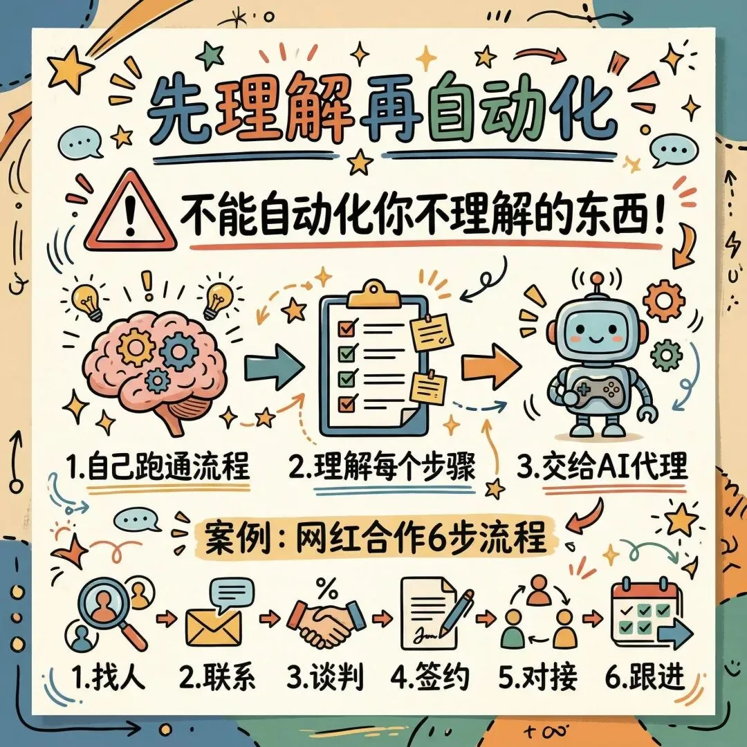 比如他的网红合作流程,是他先建立了完整的 6 步系统(从找人到跟进),验证这套流程能赚钱,然后才交给 AI 执行的。