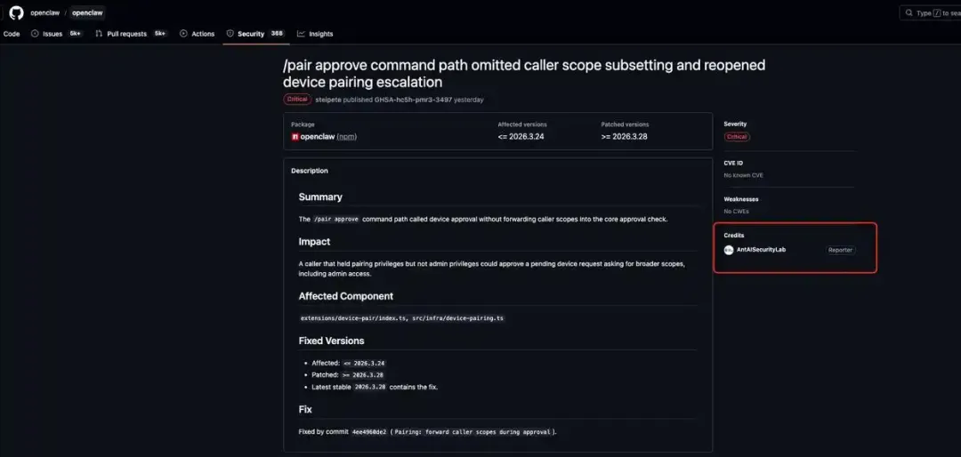 蚂蚁集团旗下的 AI 安全实验室,近期对开源智能体框架 OpenClaw 进行了一次专项安全审计。在为期三天的检测中,团队共提交了 33 个漏洞报告,而在最新发布的 2026.3.28 版本中,OpenClaw 已确认并修复其中 8 个漏洞,包括 1 个严重级别漏洞、4 个高危漏洞以及 3 个中危漏洞。