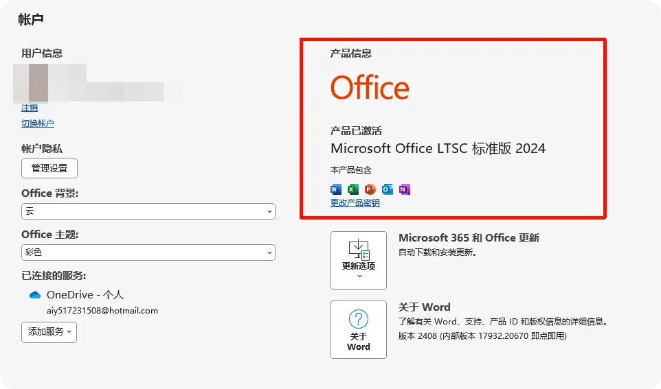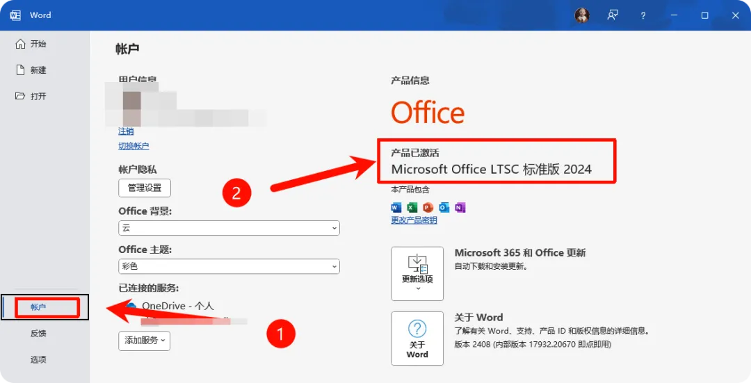 双击桌面【Word】图标启动软件,依次点击【文件】-【账户】,在产品信息处查看,显示「产品已激活」,就说明Office 2024专业增强版已成功安装并永久激活,可正常使用所有功能!