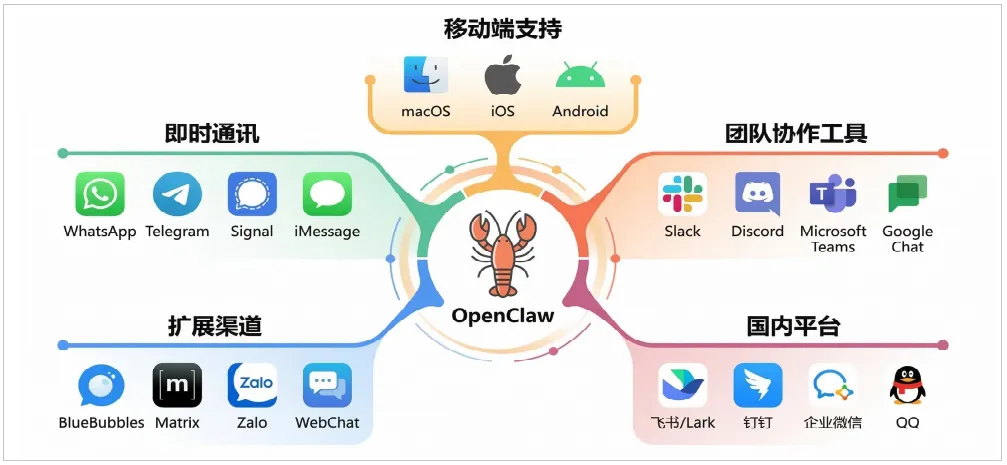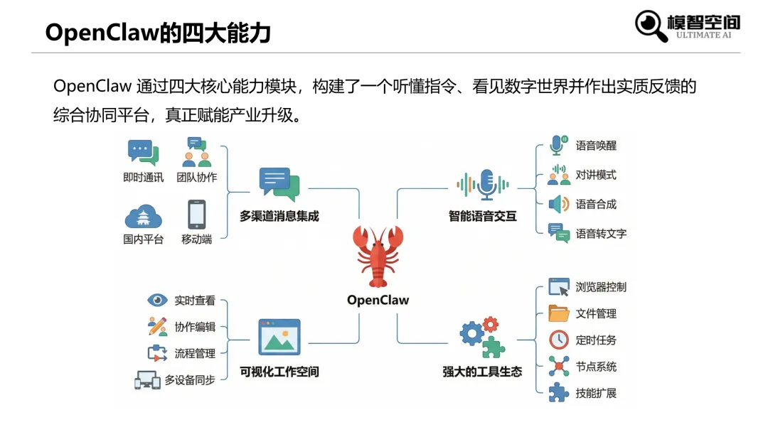 - 核心能力:多渠道消息集成、智能语音交互、可视化协同办公、工具生态执行任务,还有专属记忆机制。