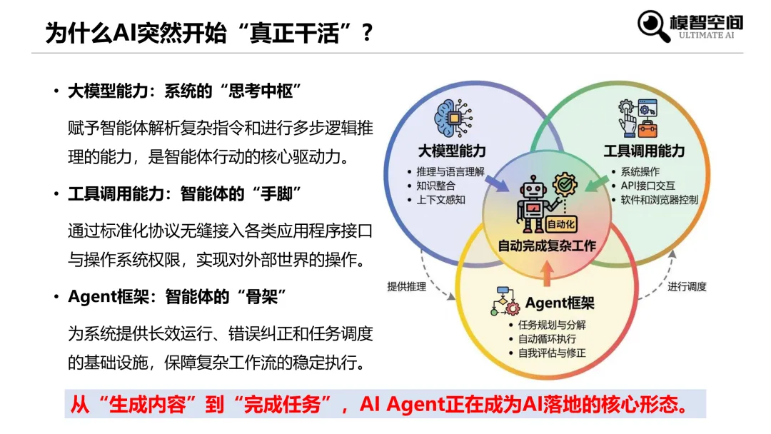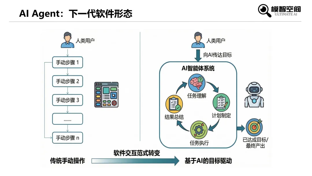 - AI 演进背景:AI 从工具、顾问发展到能自主执行任务的 AI Agent 智能体,是下一代软件形态。